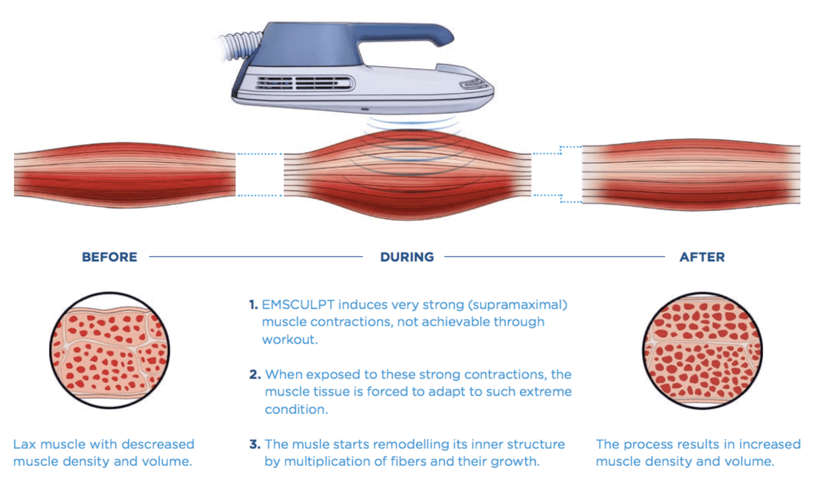 • Muscle Building: The HIFEM energy triggers supramaximal contractions (far more intense than voluntary workouts), which forces muscle tissue to adapt by building new muscle fibers.